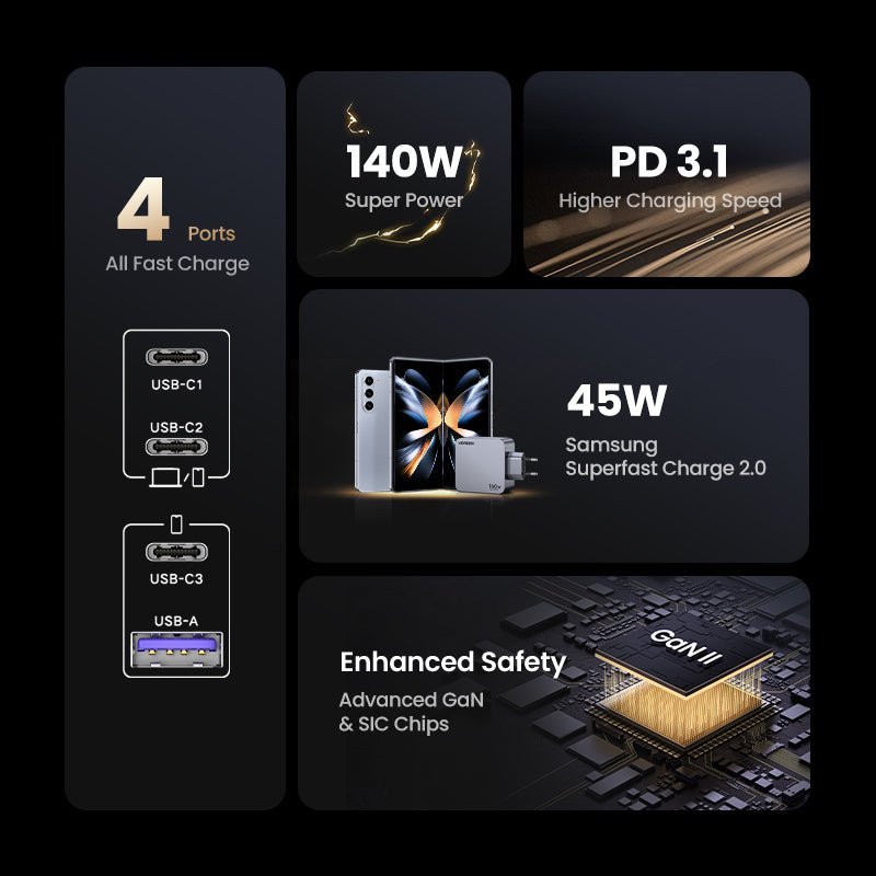 Special Feature: 140W PD 3.1 Fast Charging, 3 USB-C & 1 USB-A, Item Weight: 10.7 ounces